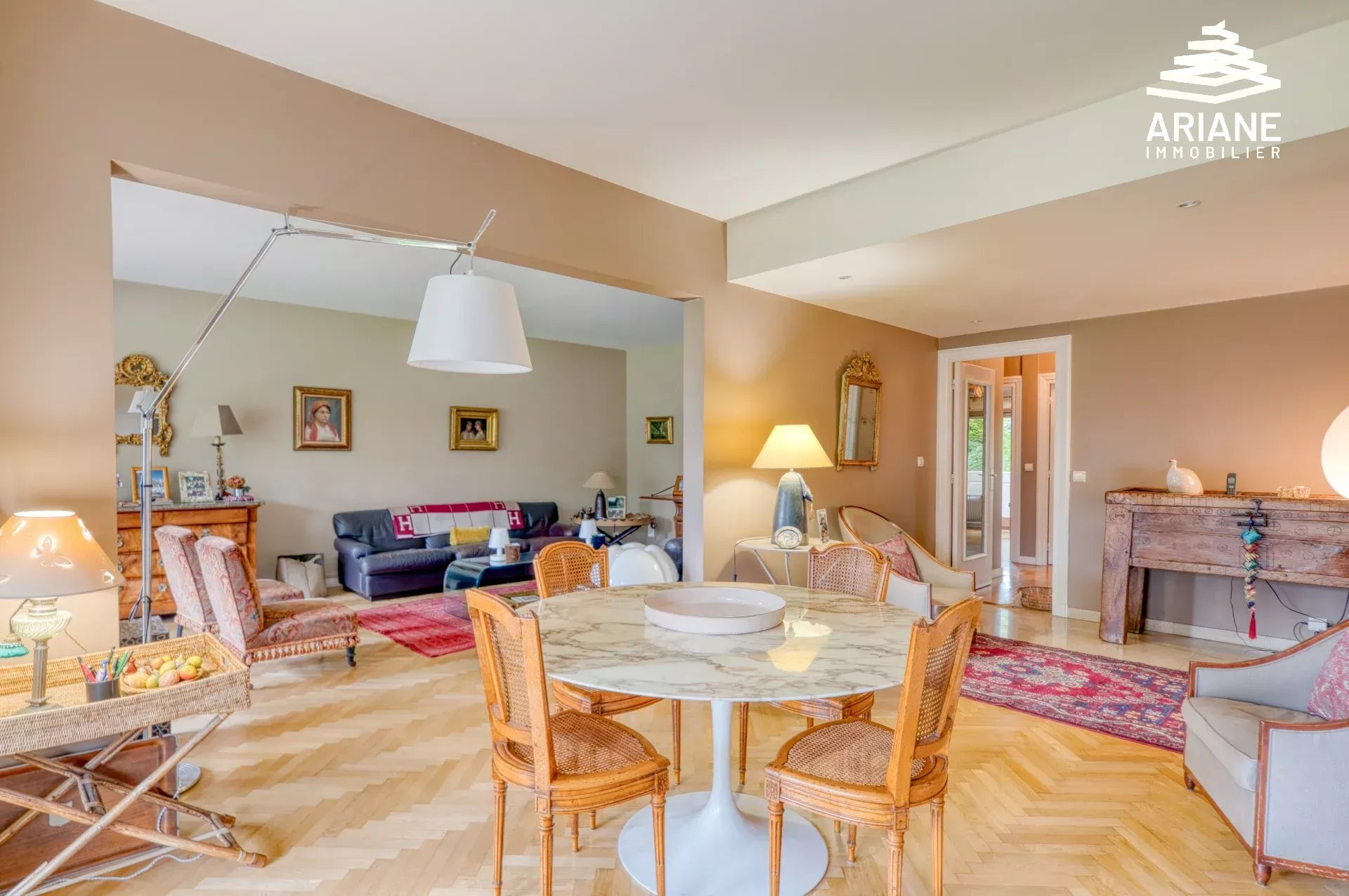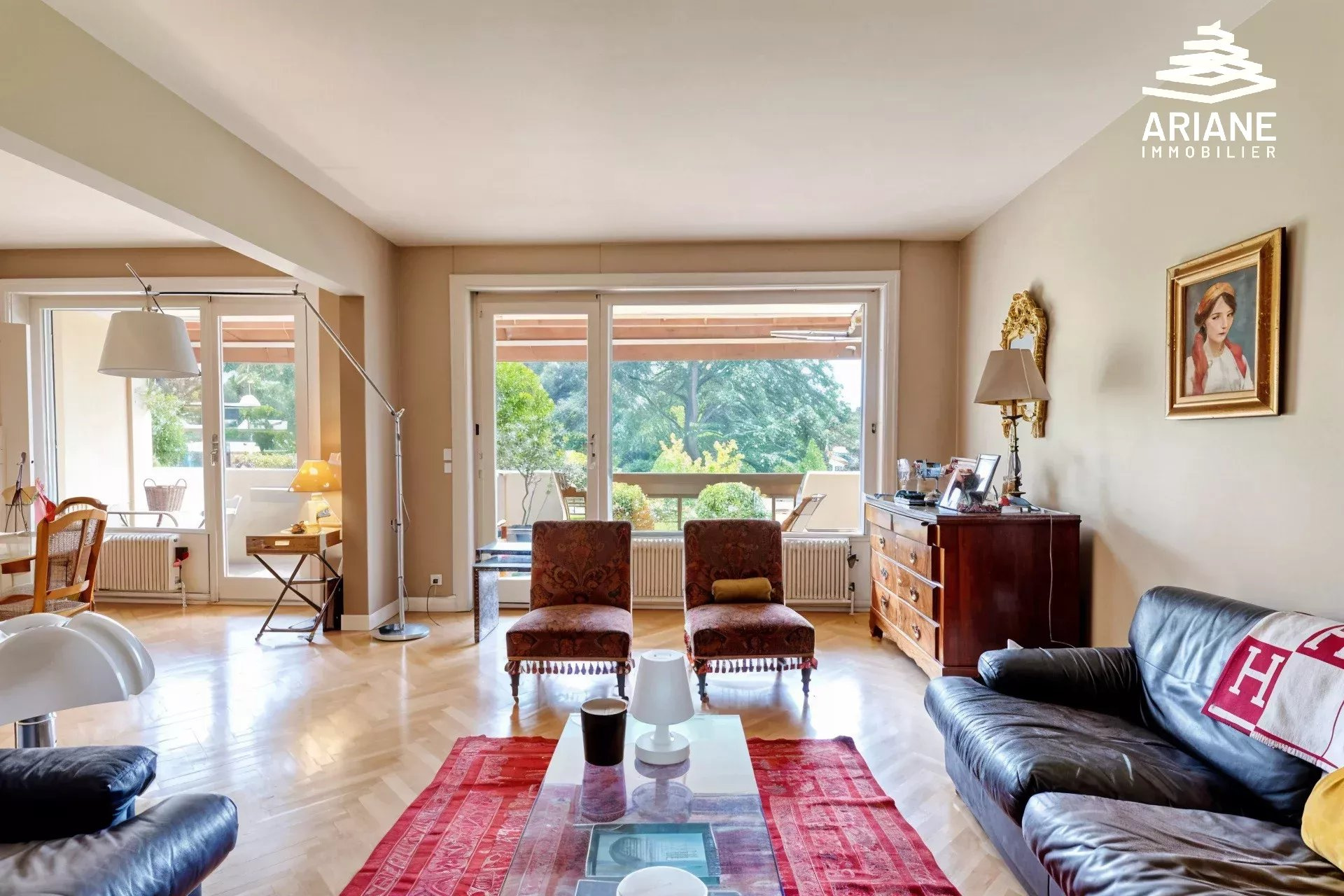 Dans un environnement privilégié et préservé au sein d’une résidence PITANCE entièrement fermée et sécurisée à quelques pas du centre village, appartement traversant Sud-est et Nord-ouest de 4 pièces lumineux et sans vis-à-vis. D’une superficie de 104 m2 donnant sur un magnifique parc arboré, l’appartement se compose d’une entrée avec rangements donnant sur un double séjour de 36 m2 prolongé par un balcon à vivre de 21 m2 avec vue dégagée sur la nature en perspective donnant une impression de maison. Une cuisine équipée, qui communique avec léspace de vie, avec un cellier/buanderie. La partie nuit se compose d’un vaste dégagement avec rangements toute hauteur, deux chambres dont une avec un espace dressing, une salle de bains et toilettes indépendantes avec lave-main. Ce bien se distingue par son état impeccable, clé en main, parfaitement au gout du jour et un DPE : C. Une cave complète lénsemble. Un garage fermé en sous-sol est proposé en SUS. La résidence bénéficie d’un emplacement idéal à proximité immédiate du centre d’Ecully à pied, des écoles et transports. Les charges de copropriété incluent un gardien, léntretien des parties communes, du parc de la piscine et des équipements sportifs. Charges : 371 euros/mois, comprenant eau, gardien, entretien parties communes, espaces verts, piscines. Copropriété de 253 lots. Pas de procédure en cours. Pour plus d’informations et une visite privée. CONTACTER CAROLINE GENEVOIS - 06 98 18 38 32 Agent commercial’ RSAC de Lyon No501 214 399