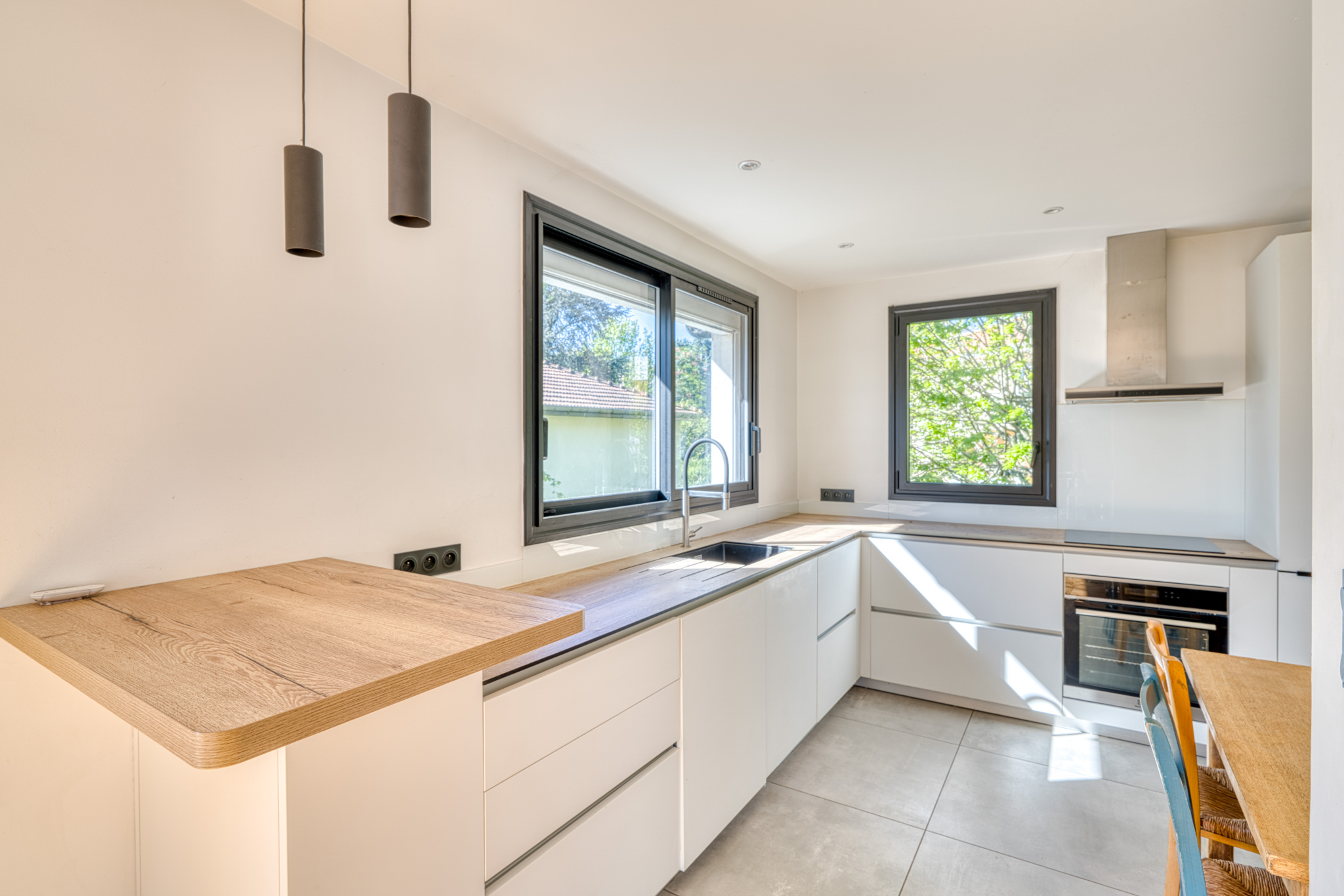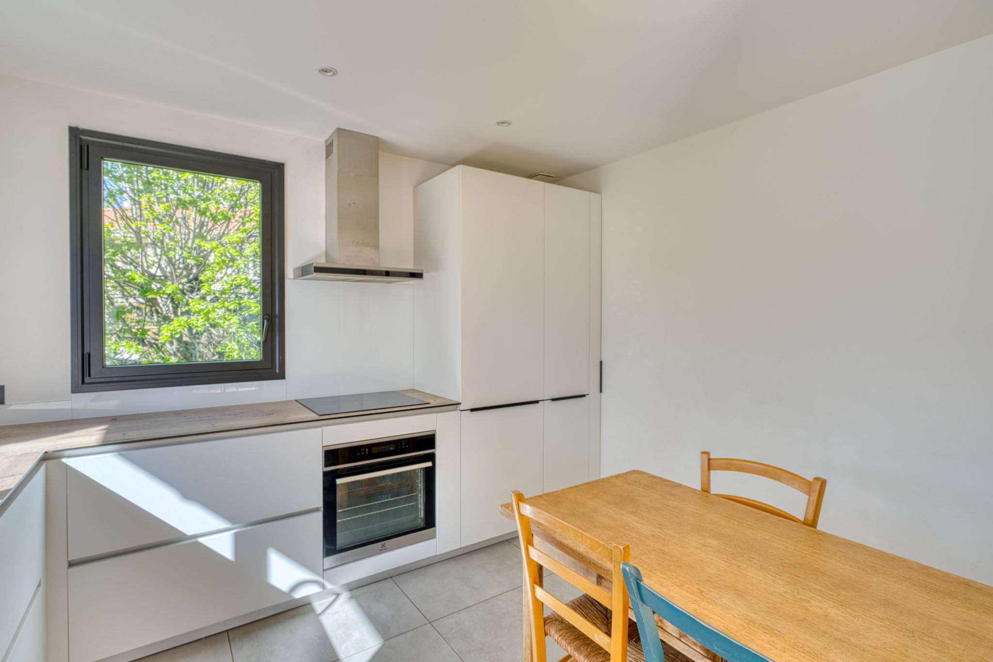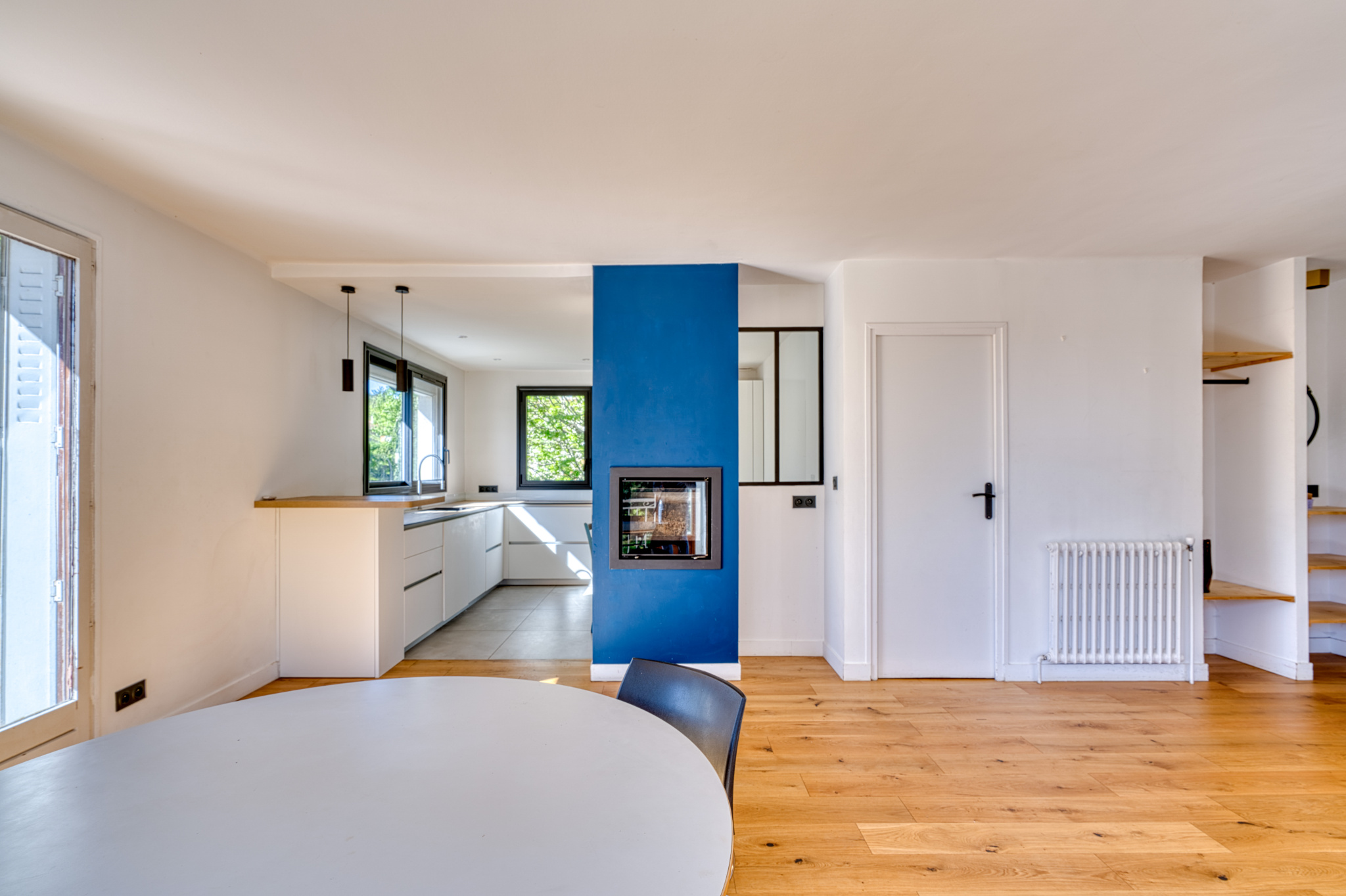 La cuisine équipée, avec un espace repas, est semie ouverte sur la salle à manger et bénéficie de nombreux rangements.